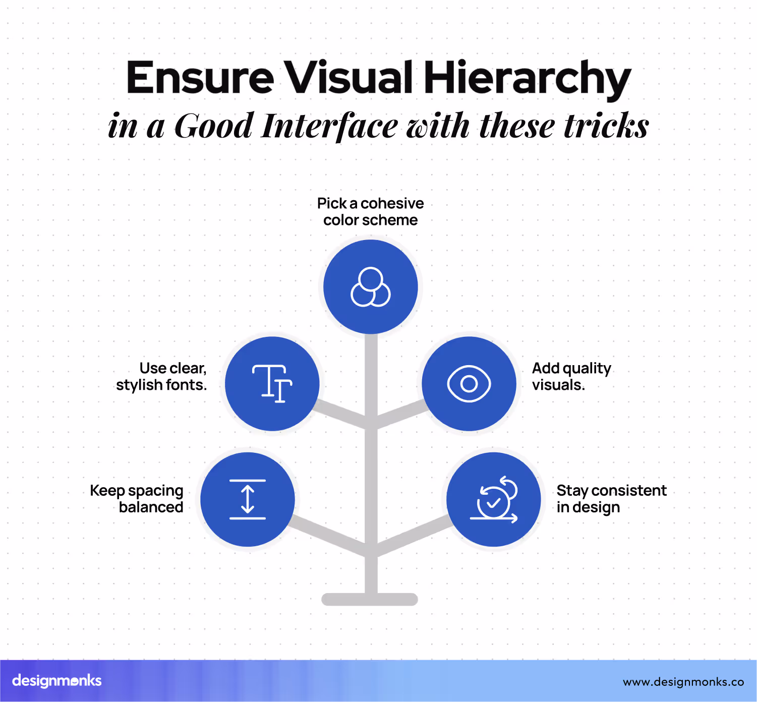 Guide users’ attention with a strong visual hierarchy. Use size, color, and placement to highlight important elements like buttons or headlines. For example, make call-to-action buttons stand out with bold colors and larger sizes.
