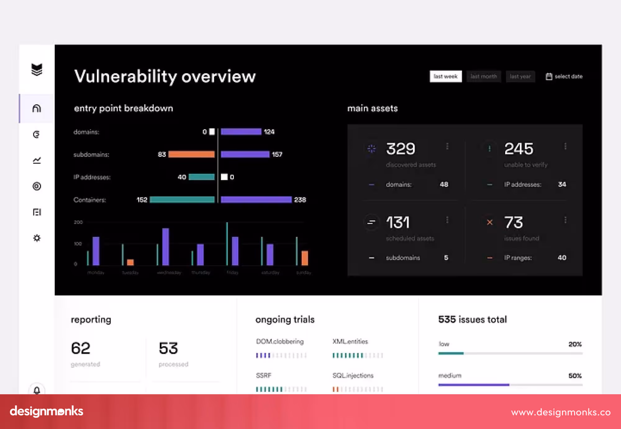 Before you start creating your own cybersecurity dashboard design or collaborating with a design team, you must have some inspiration to get an idea from. For that, you don’t have to check countless sites. Here, get 10 nicely-designed cybersecurity dashboard design examples in a list:
