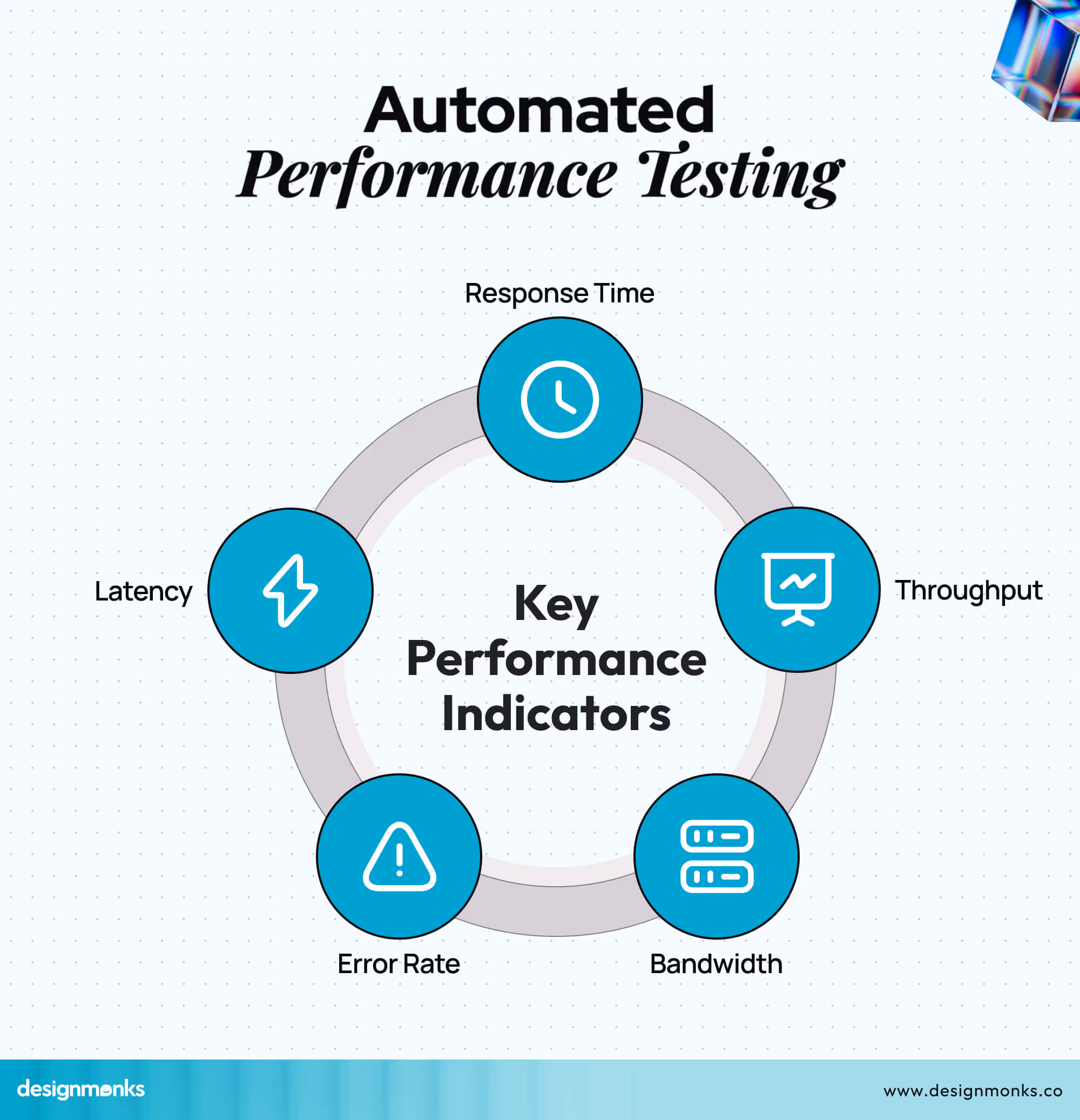 Automated performance testing uses tools to assess how software performs under different conditions. The main goal is to ensure applications remain fast, stable, and efficient, even as demand changes. This is tested using these key indicators: