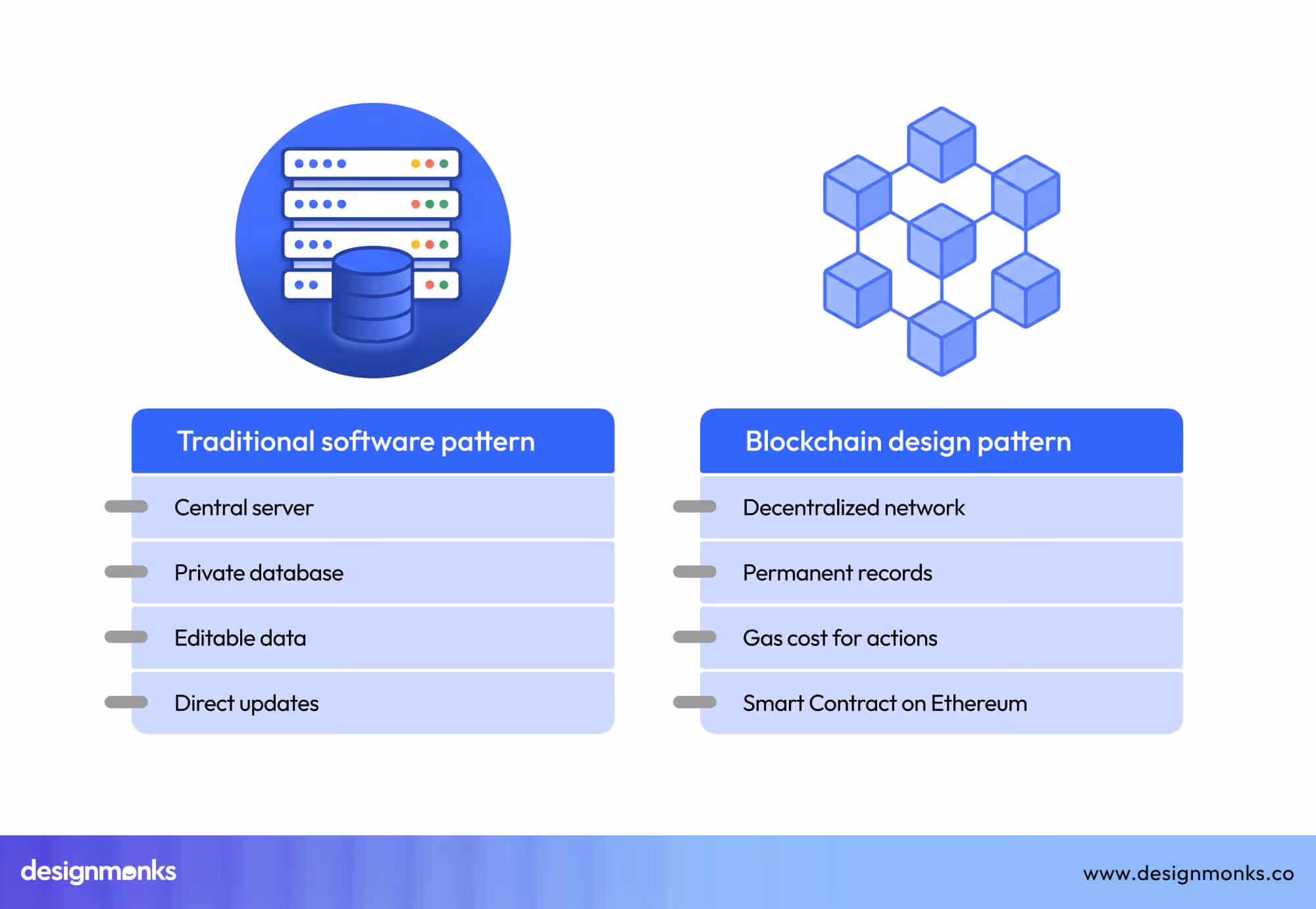 Traditional software patterns focus on central servers and private databases. Blockchain UX design patterns work inside shared networks like Ethereum.