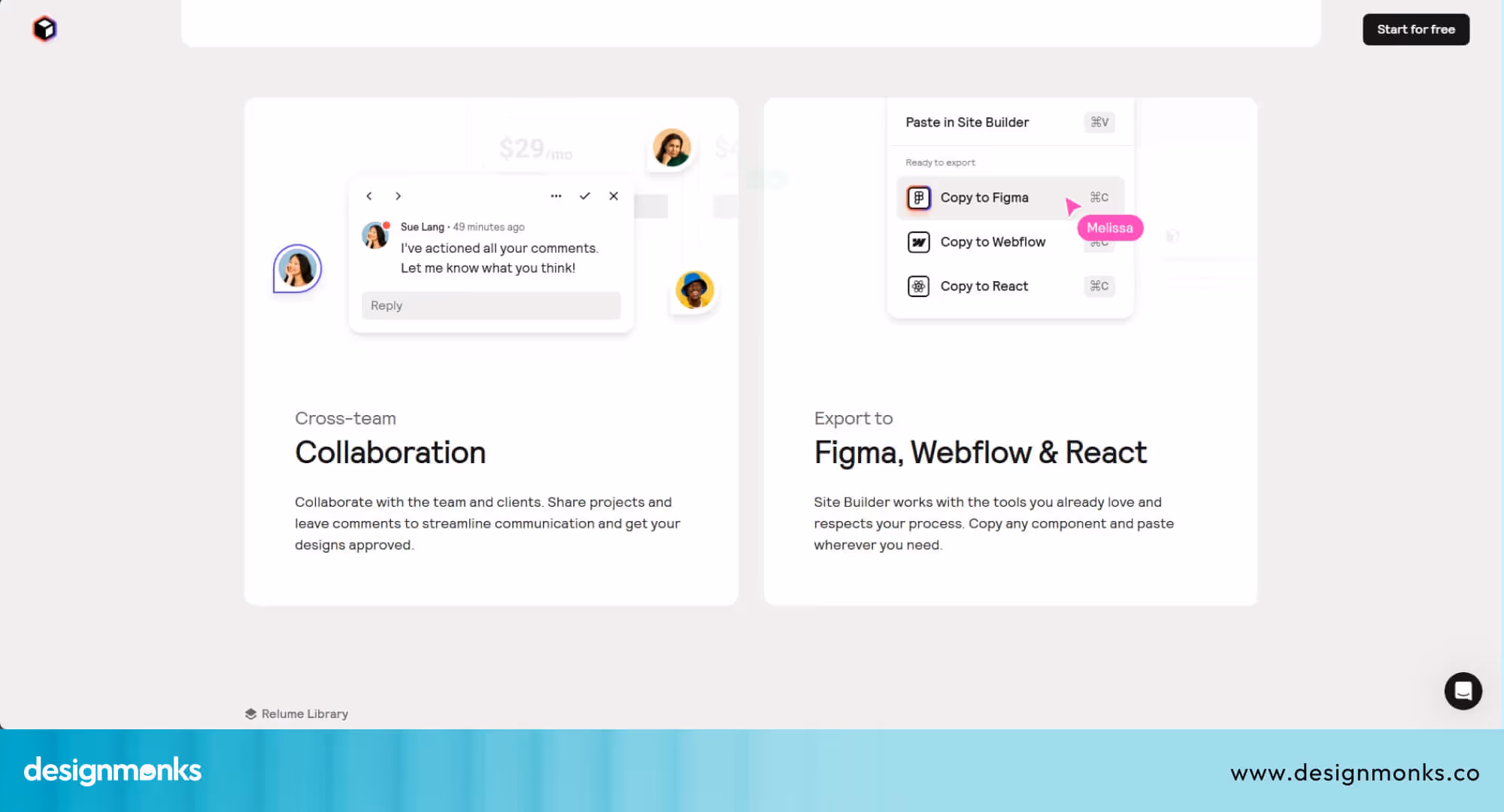 Built to streamline the early-stage design process, Relume supports seamless exports to Figma, Webflow, and React with a smooth handoff and customization. Designers can instantly visualize structure, layout, and content while still retaining full control over visuals like fonts, images, and colors.