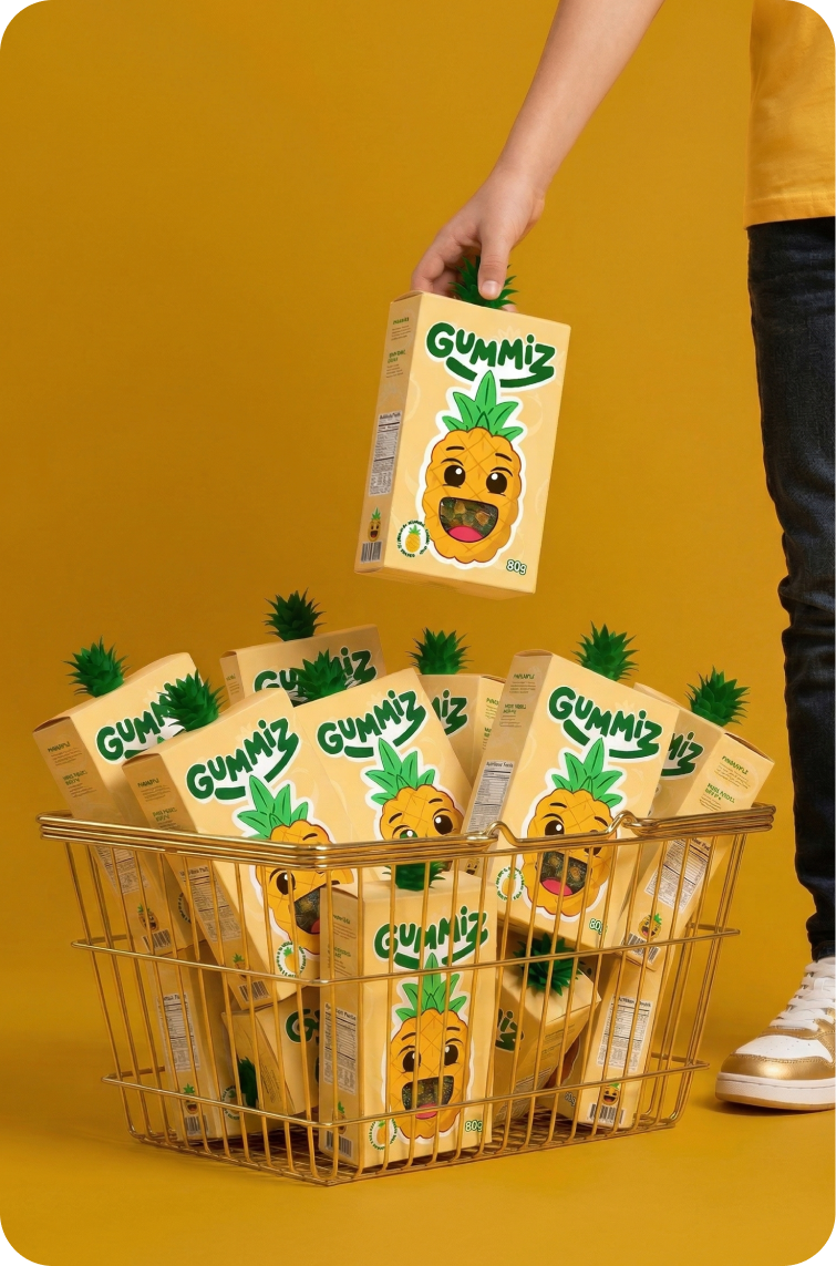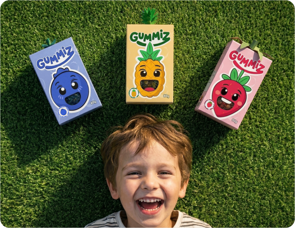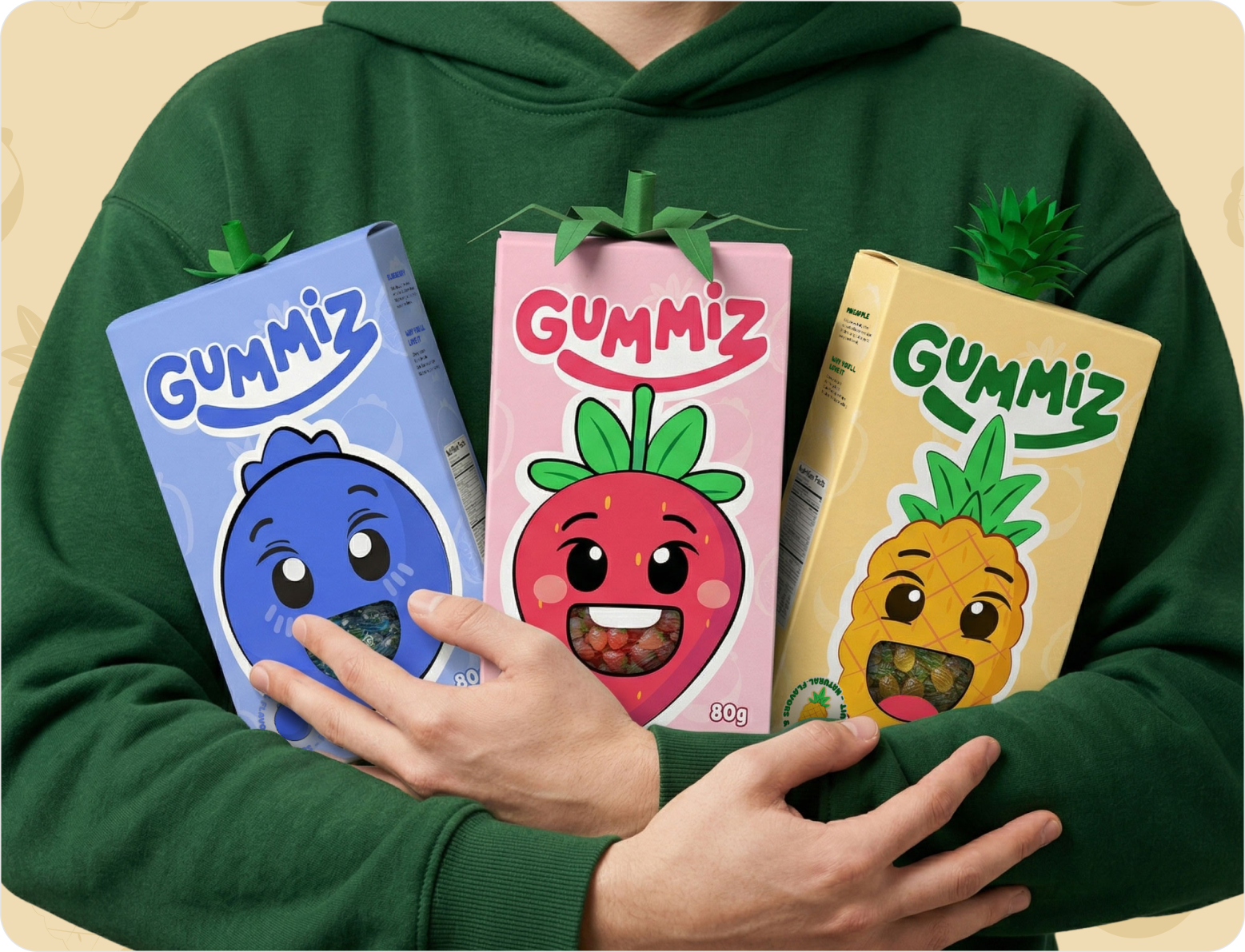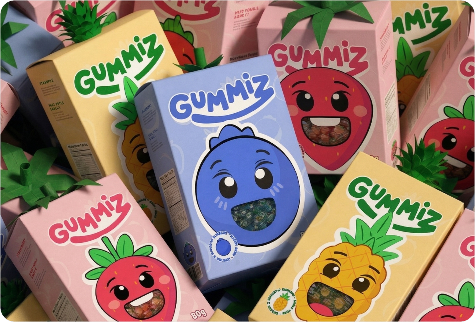 The final outcome delivered a bold and cohesive visual identity that elevated Gummiz as a distinctive gummy candy brand. The packaging system achieved strong shelf visibility through vibrant colors and expressive characters. Consistent design across flavor variants improved recognition, while 3D mockups validated real-world impact. It ensures both emotional appeal and commercial effectiveness in retail environments.