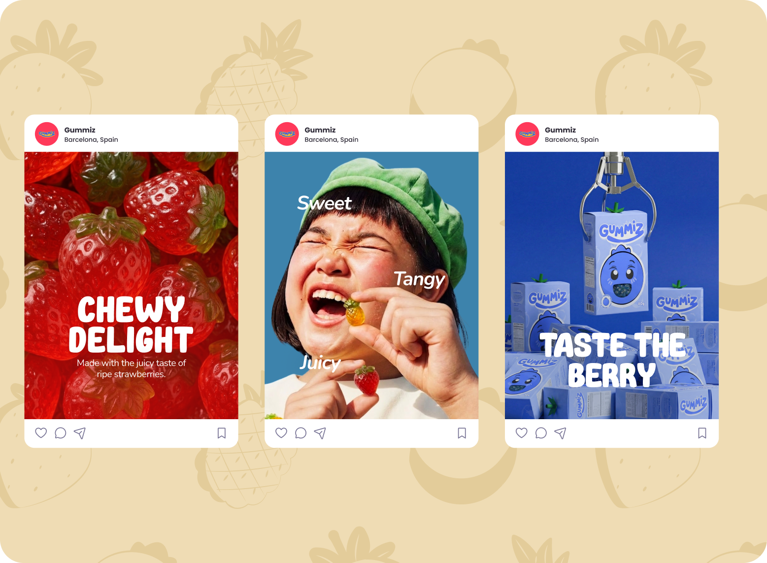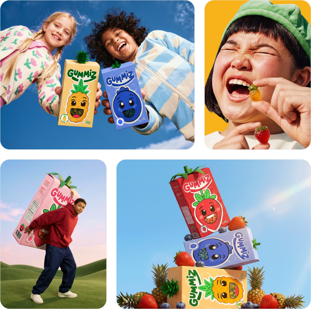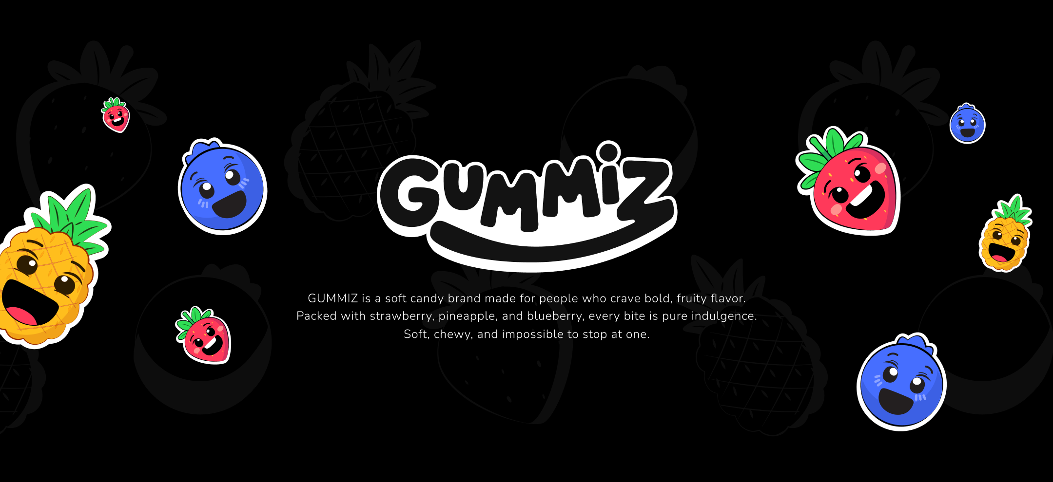 Gummiz is a playful gummy candy brand developed through a vibrant visual identity and packaging system. The project focuses on expressive fruit characters, bold color palettes, and playful typography to strengthen shelf impact, emotional engagement, and brand recognition. At the same time, this project ensures consistency across multiple flavor variants and packaging applications.
